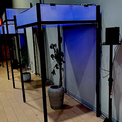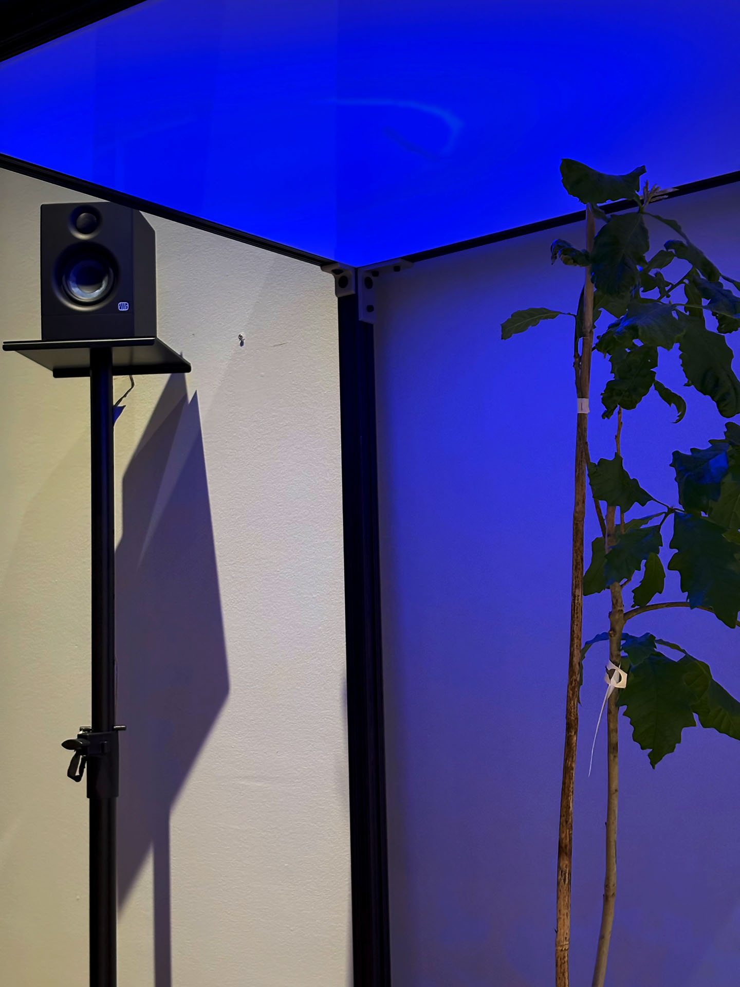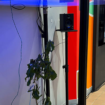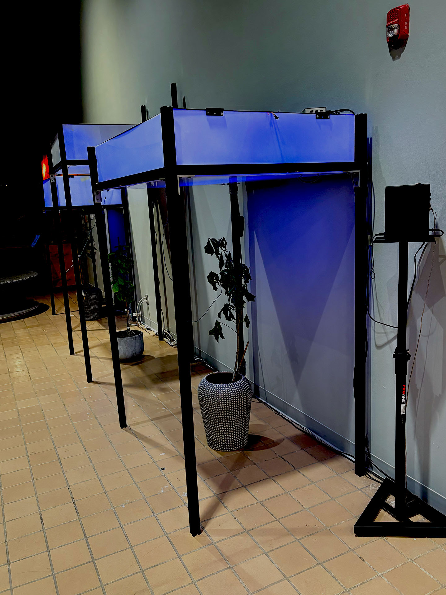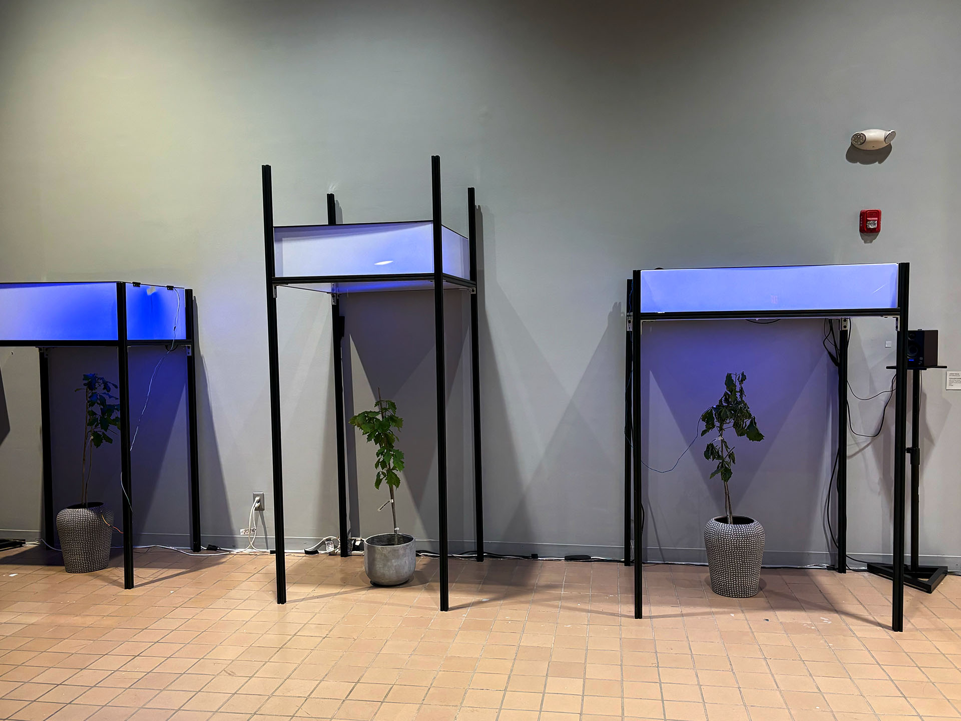 These various internal and external datasets will be sent to a server that is downloaded, catalogued, and stored while also sending the data into the system which informs the agent’s model that control the light's intensity and color along with various computer generated soundwave frequencies or oscillators. Sensors and electrodes attached to the plants gather biodata from the grouping of plants within a controlled or fabricated micro-environment. Specifically, I am interested in reading the electrical current signals moving throughout the plant and the CO2 levels, and this data controls the installation’s system of generative light and sound that is in turn providing light and sound for the plants in a feedback loop. Additionally, a sound system within the space translates the data into projected soundwaves that fills the space with multiple channels of audio. LED strips in light boxes suspended on top of a frame serve as grow lights that generate light above the plants. As I stated, the biodata is then transcoded and interpreted into various different experiential forms such as frequencies of soundwaves, color and intensity of light, and rhythm of changing light. For the final installation piece, the work will be scaled up to include multiple 'tree nodes' which are networked together where a more nuanced and complex interaction of light and sound will evolve between the various groupings.