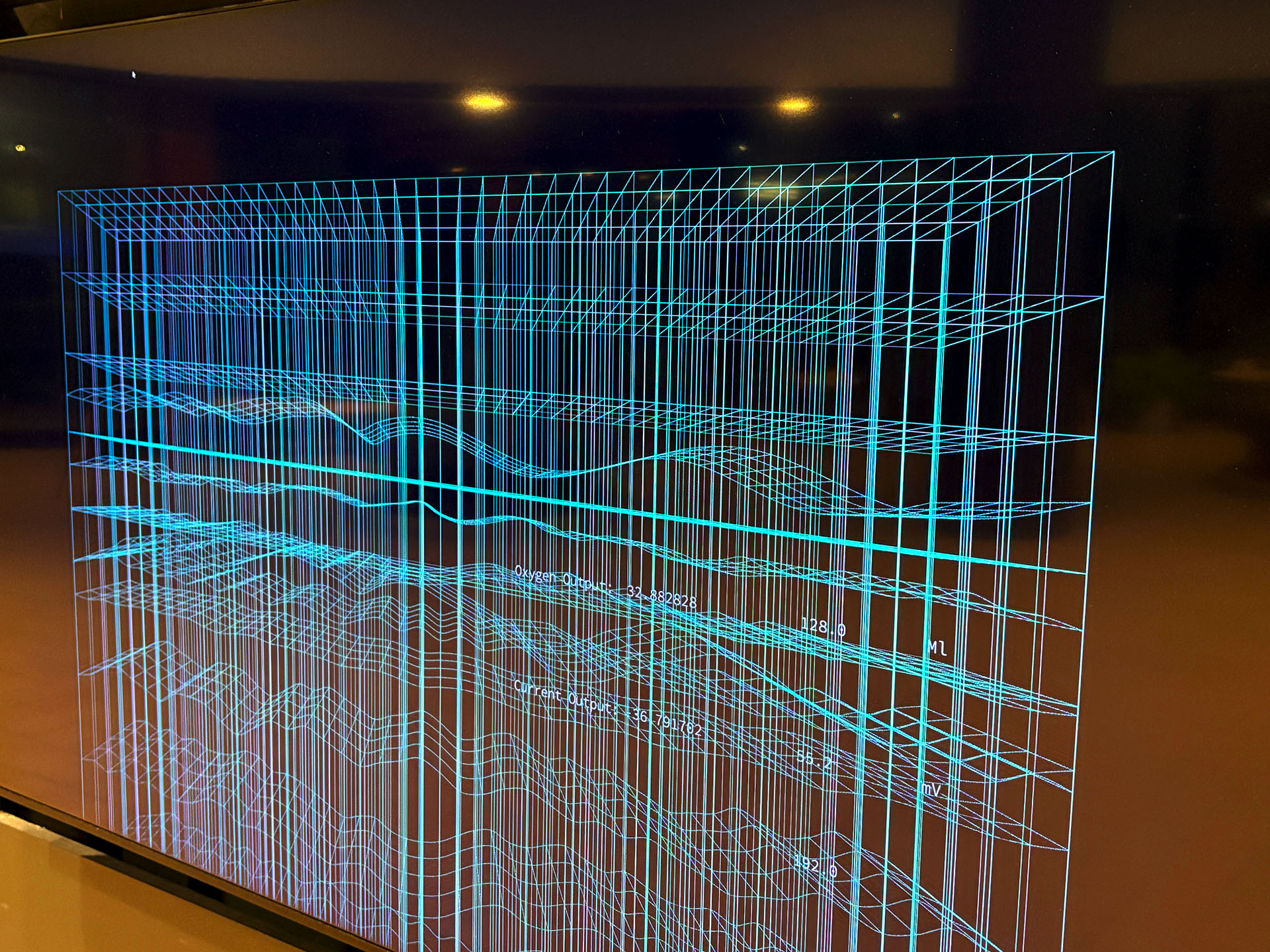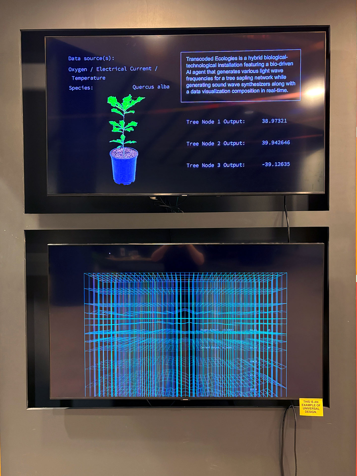 Transcoded Ecologies is a hybrid biological-technological installation featuring a bio-driven AI agent that generates various light wave frequencies for a tree sapling network while generating sound wave synthesizers along with a data visualization composition in real-time. The work creates an immersive experience where chemical and physical biproducts of an array of plants or tree saplings is measured and assisted by a machine agent that has a model of optimum environmental and light conditions. The agent builds different contexts from climate data and biological cycles from time series of days, weeks, and years representing a time frame from a pre-industrial revolution framework. Climate and chemical data is also gathered from various natural ecosystems in and around the site of the installation space in order to superimpose the data to create a model of the microclimates in that given locality. An array of ‘tree nodes’ are each placed within their own metal frames. The frames suspend a large grow lightbox over each plant, and each tree node in the network gathers biodata such as CO2, temperature, light levels (visible and infrared), and electrical current measurements that is produced by the plants.