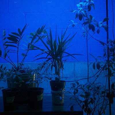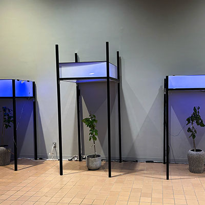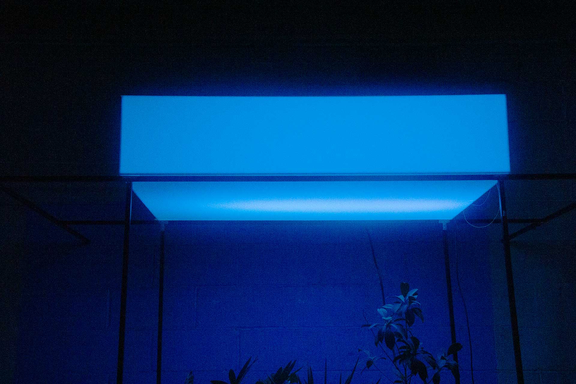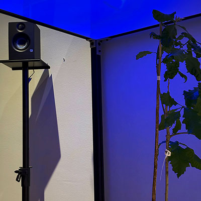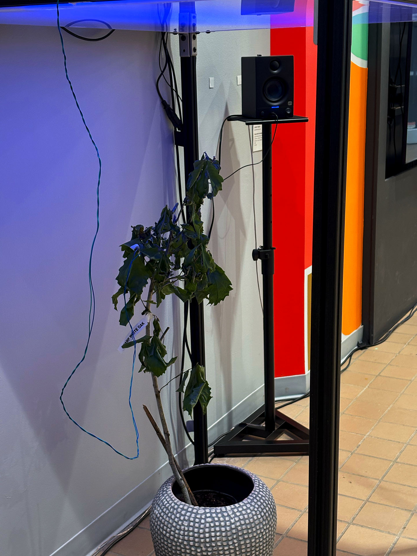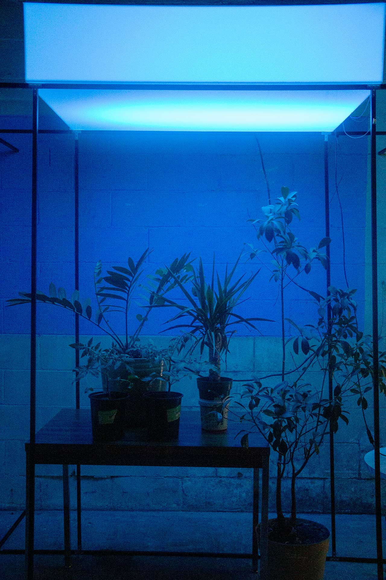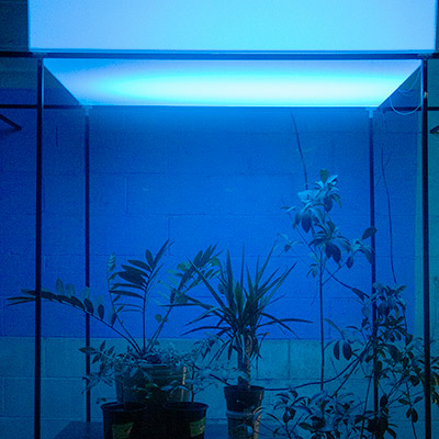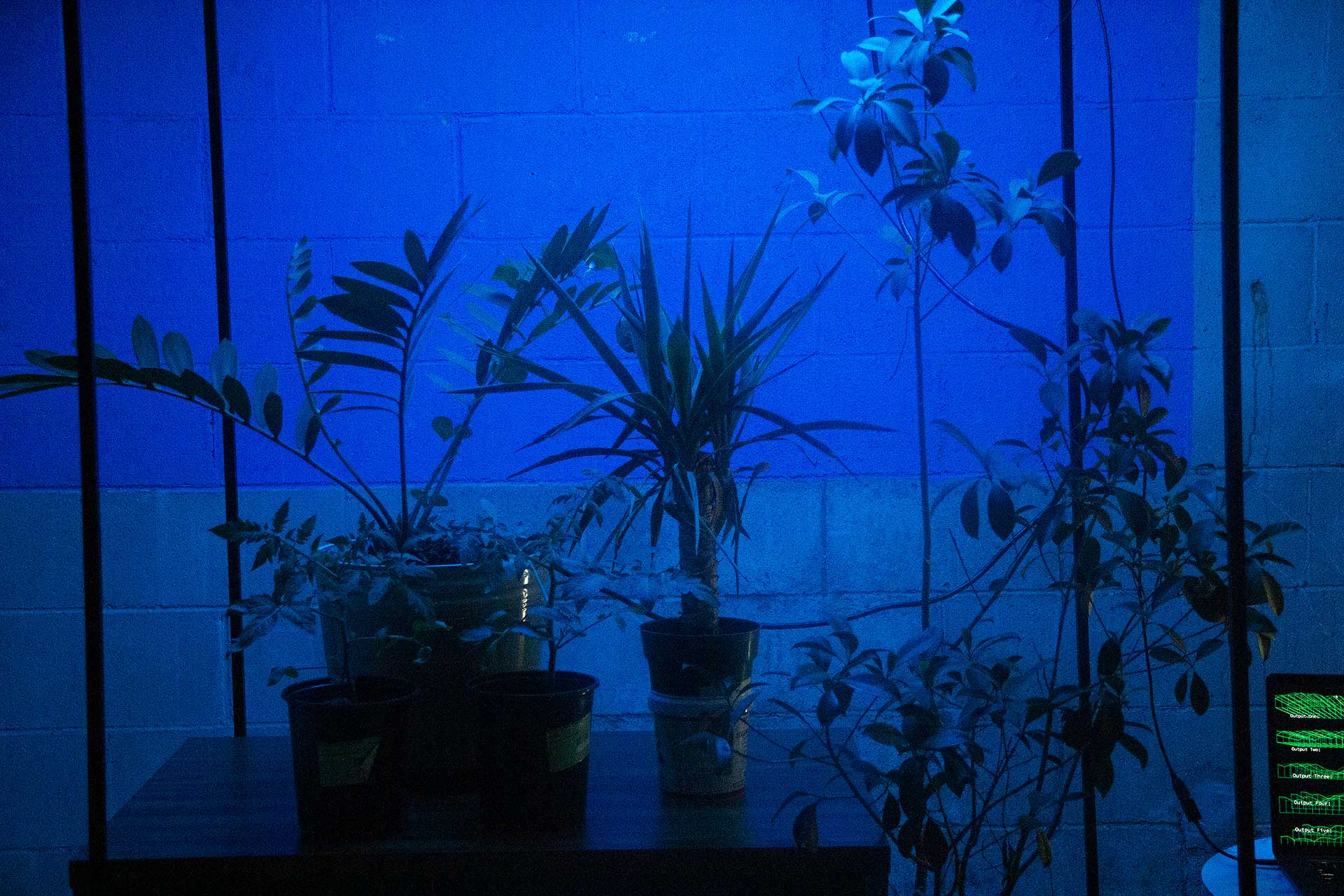These various internal and external datasets will be sent to a server that is downloaded, catalogued, and stored while also sending the data into the system which informs the agent’s model that control the light's intensity and color along with various computer generated soundwave frequencies or oscillators. Sensors and electrodes attached to the plants gather biodata from the grouping of plants within a controlled or fabricated micro-environment. Specifically, I am interested in reading the electrical current signals moving throughout the plant and the CO2 levels, and this data controls the installation’s system of generative light and sound that is in turn providing light and sound for the plants in a feedback loop. Additionally, a sound system within the space translates the data into projected soundwaves that fills the space with multiple channels of audio. LED strips in light boxes suspended on top of a frame serve as grow lights that generate light above the plants. As I stated, the biodata is then transcoded and interpreted into various different experiential forms such as frequencies of soundwaves, color and intensity of light, and rhythm of changing light. For the final installation piece, the work will be scaled up to include multiple 'tree nodes' which are networked together where a more nuanced and complex interaction of light and sound will evolve between the various groupings.