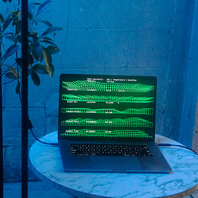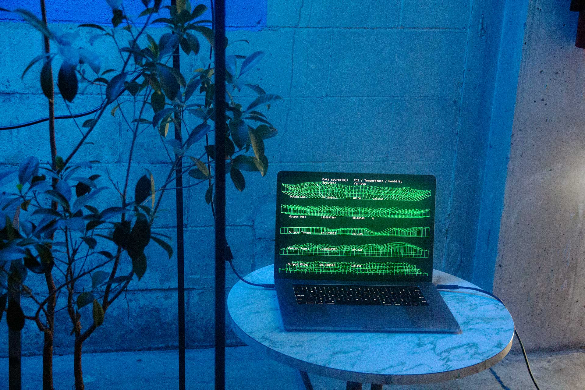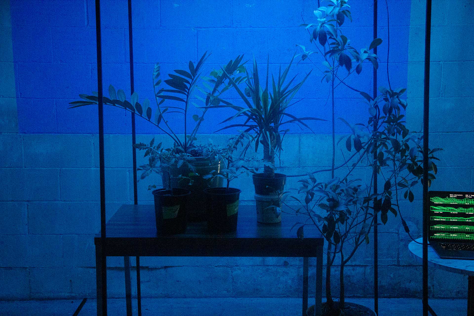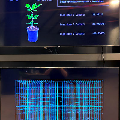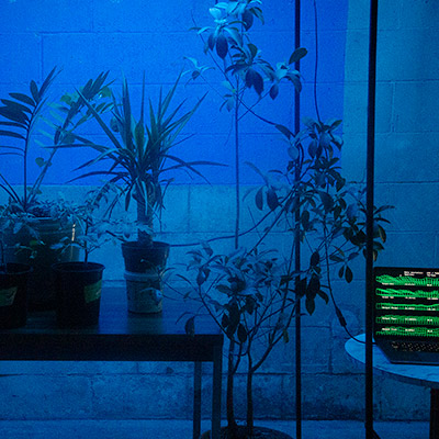 Transcoded Ecologies is a hybrid biological-technological installation featuring a bio-driven AI agent that generates various light wave frequencies for a tree sapling network while generating sound wave synthesizers along with a data visualization composition in real-time. The work creates an immersive experience where chemical and physical biproducts of an array of plants or tree saplings is measured and assisted by a machine agent that has a model of optimum environmental and light conditions. The agent builds different contexts from climate data and biological cycles from time series of days, weeks, and years representing a time frame from a pre-industrial revolution framework. Climate and chemical data is also gathered from various natural ecosystems in and around the site of the installation space in order to superimpose the data to create a model of the microclimates in that given locality. An array of ‘tree nodes’ are each placed within their own metal frames. The frames suspend a large grow lightbox over each plant, and each tree node in the network gathers biodata such as CO2, temperature, light levels (visible and infrared), and electrical current measurements that is produced by the plants.